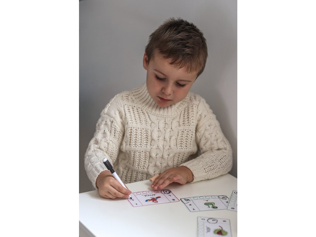 🟡 Kartičková aktivitka Písmenkový detektív ✍️ - 40 kartičiek so slovami, kde dieťa dopĺňa prvé a posledné písmenko a označuje počet slabík. Rozvíja čítanie, fonetické uvedomovanie a koncentráciu.