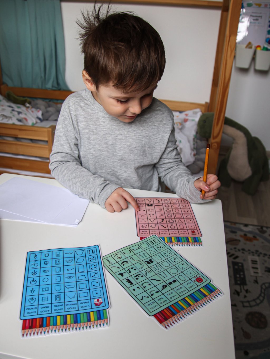 1️⃣ Dieťa si vyberie tabuľku podľa toho, čo chce kresliť (tvár, domček, postavička alebo príšerka).