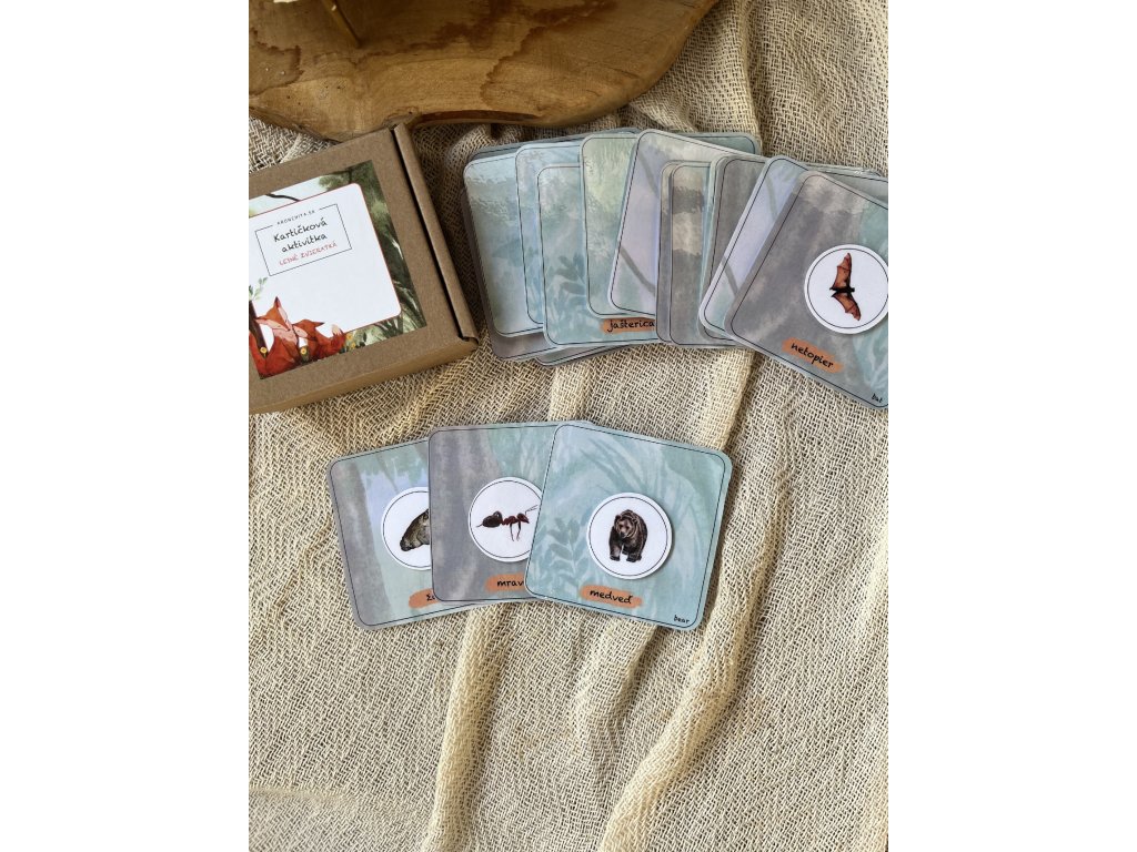 - 23 kartičiek s rôznymi lesnými zvieratkami, ktoré deti spoznáva a učí sa ich názvy v slovenčine.