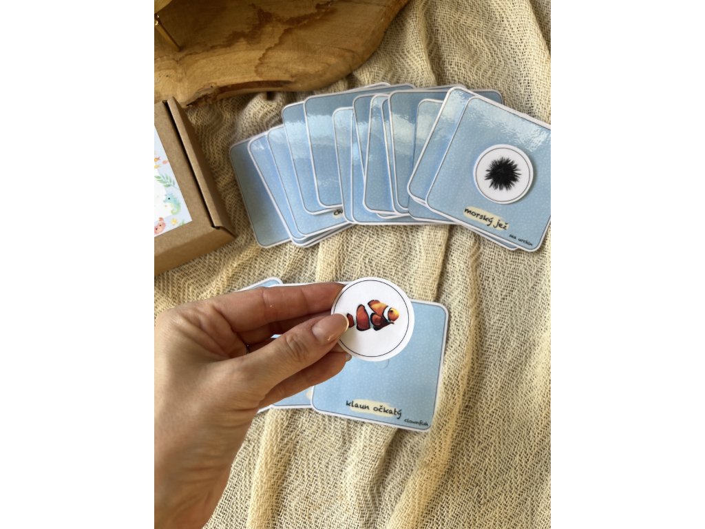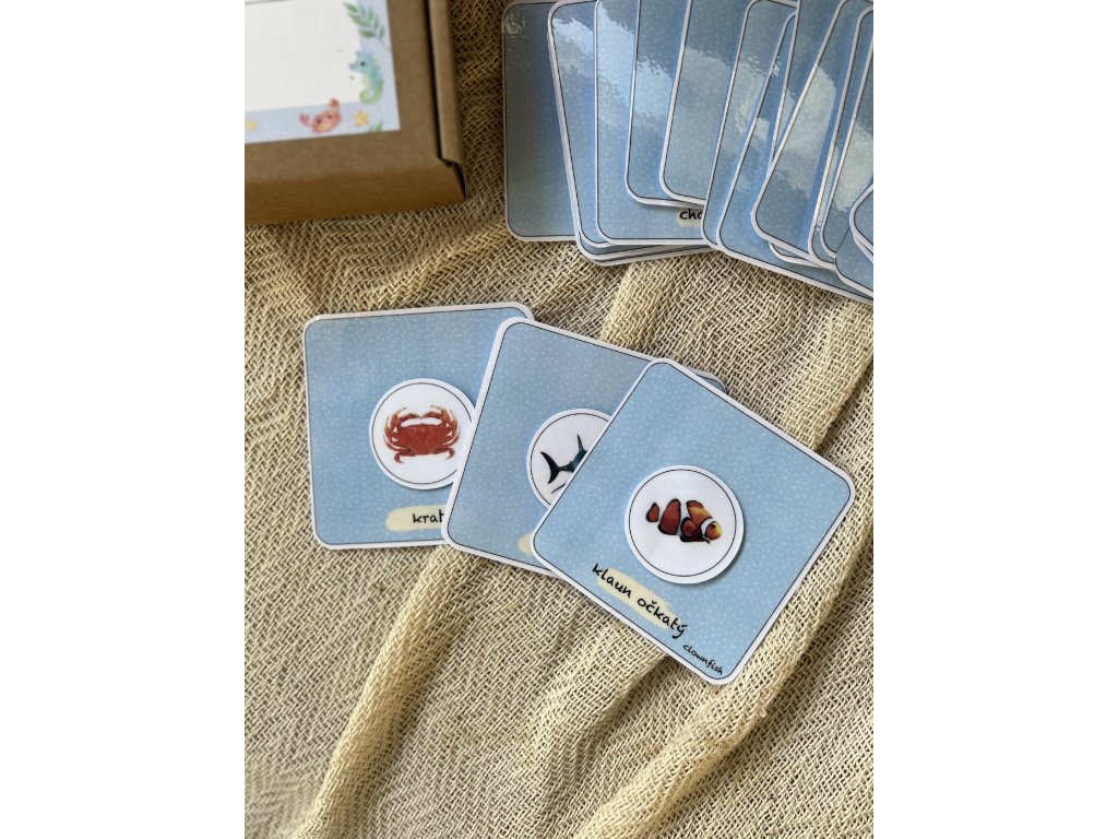 - 22 kartičiek so slovenskými názvami morských živočíchov, od pestrofarebných rýb až po fascinujúce morské tvory.