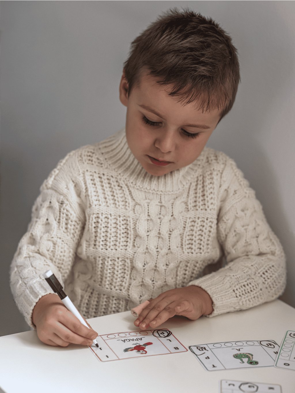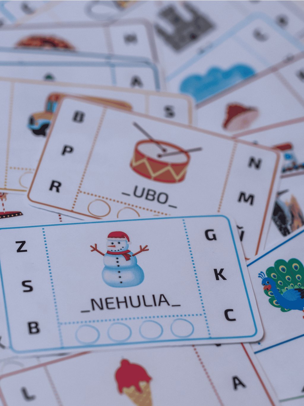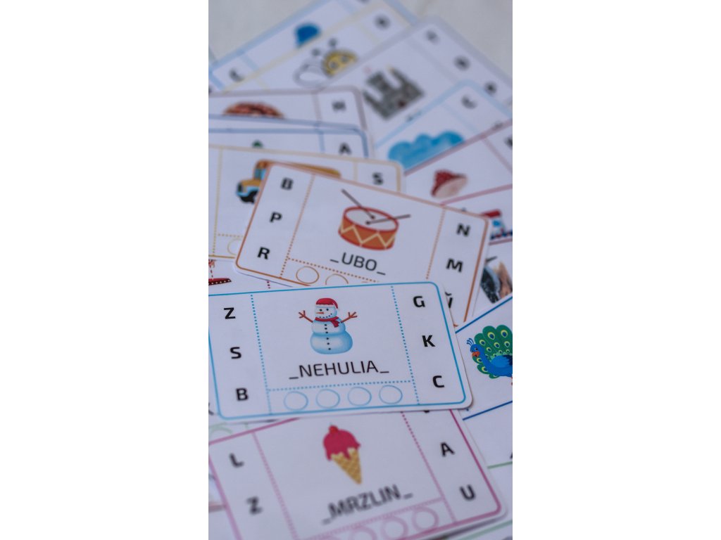 📖 Na každej kartičke dieťa zakrúžkuje chýbajúce prvé a posledné písmenko slova a určí počet slabík označením guličiek.