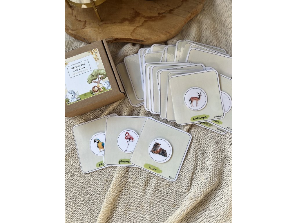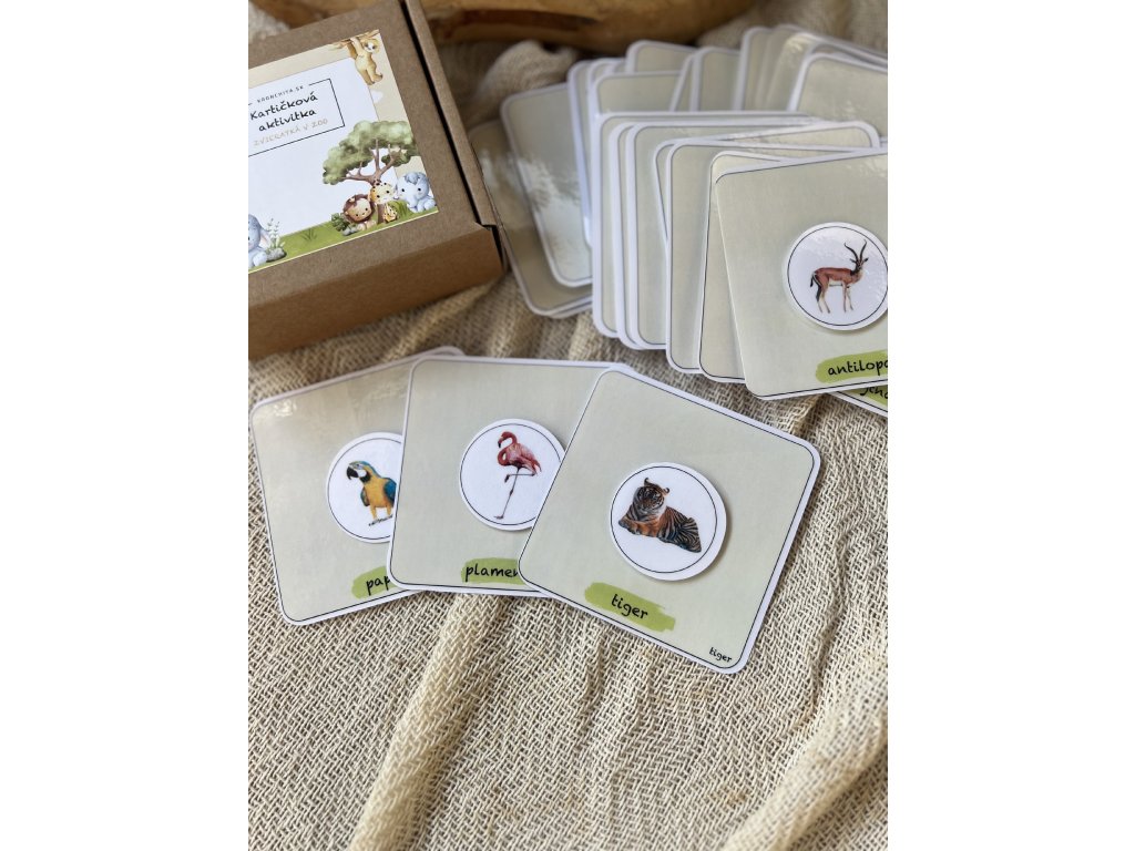 - 29 kartičiek so zvieratkami, ktoré deti môžu spoznávať a učiť sa ich názvy v slovenčine.